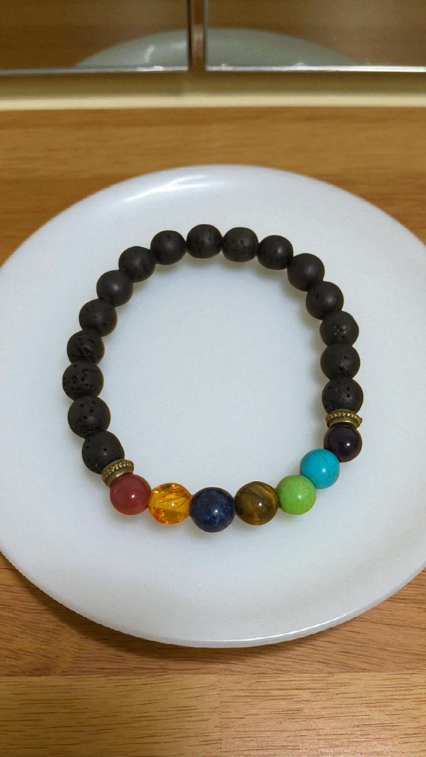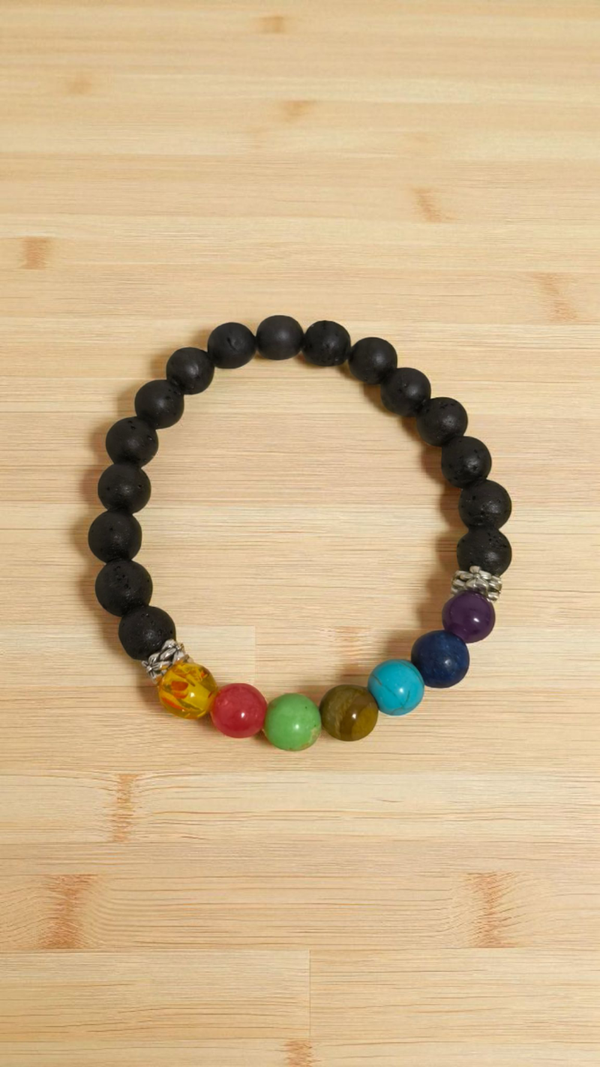 Verleihen Sie Ihrem Outfit einen Hauch von Eleganz mit diesem handgefertigten Armband. Die mehrfarbigen Chakra Armbänder bestehend aus Glasperlen und Lava Perlen sind ein einzigartiges Accessoire, das für jeden Anlass geeignet ist – sei es zum Geburtstag, Jahrestag oder zum Valentinstag.