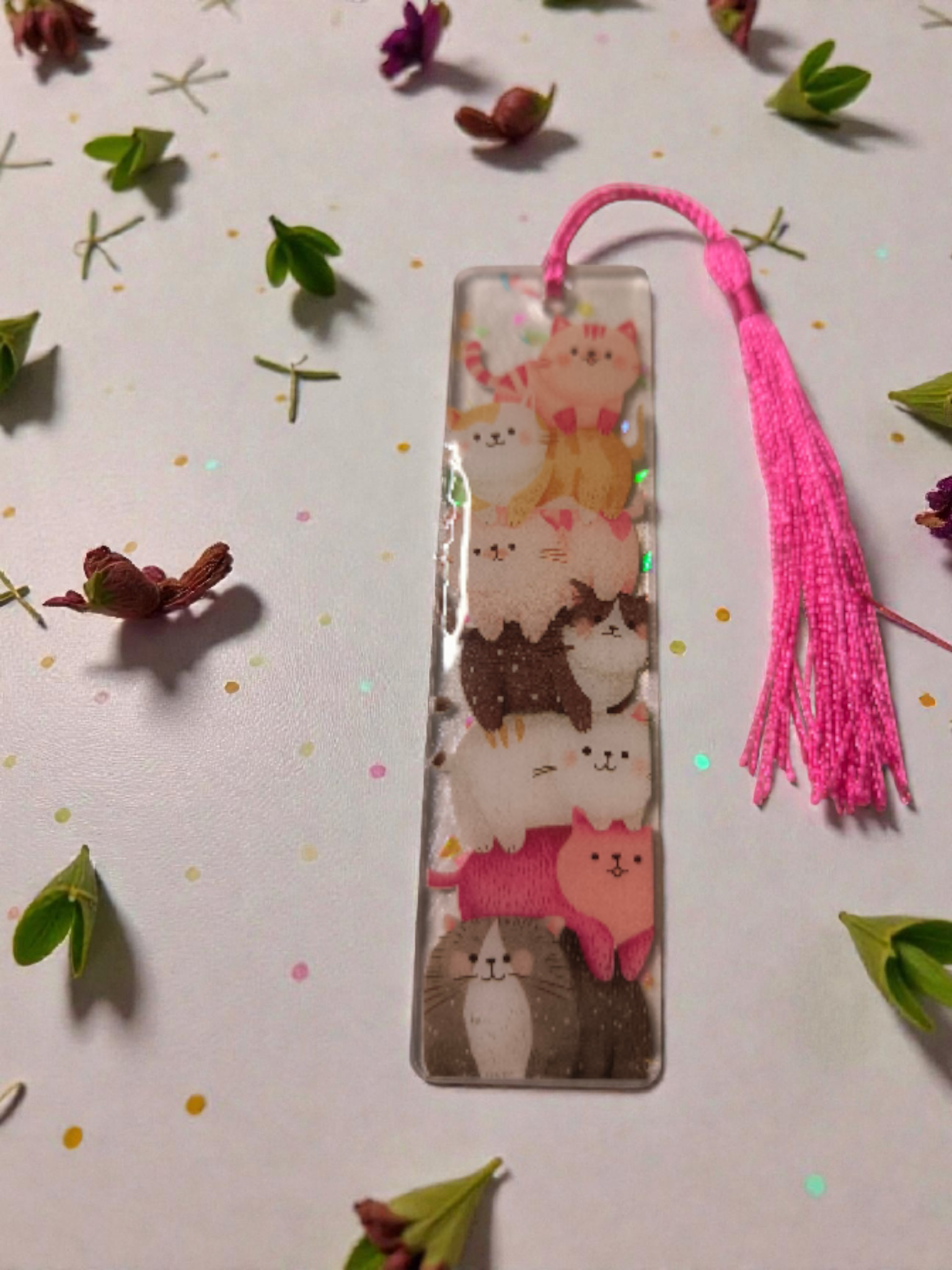 Dieses liebevoll handgefertigte Lesezeichen aus hochwertigem Epoxidharz ist ein echter Hingucker für jedes Buch. Eingegossene Motive – wie süße Katzen, Blumen oder andere Designs – machen jedes Stück zu einem kleinen Unikat.