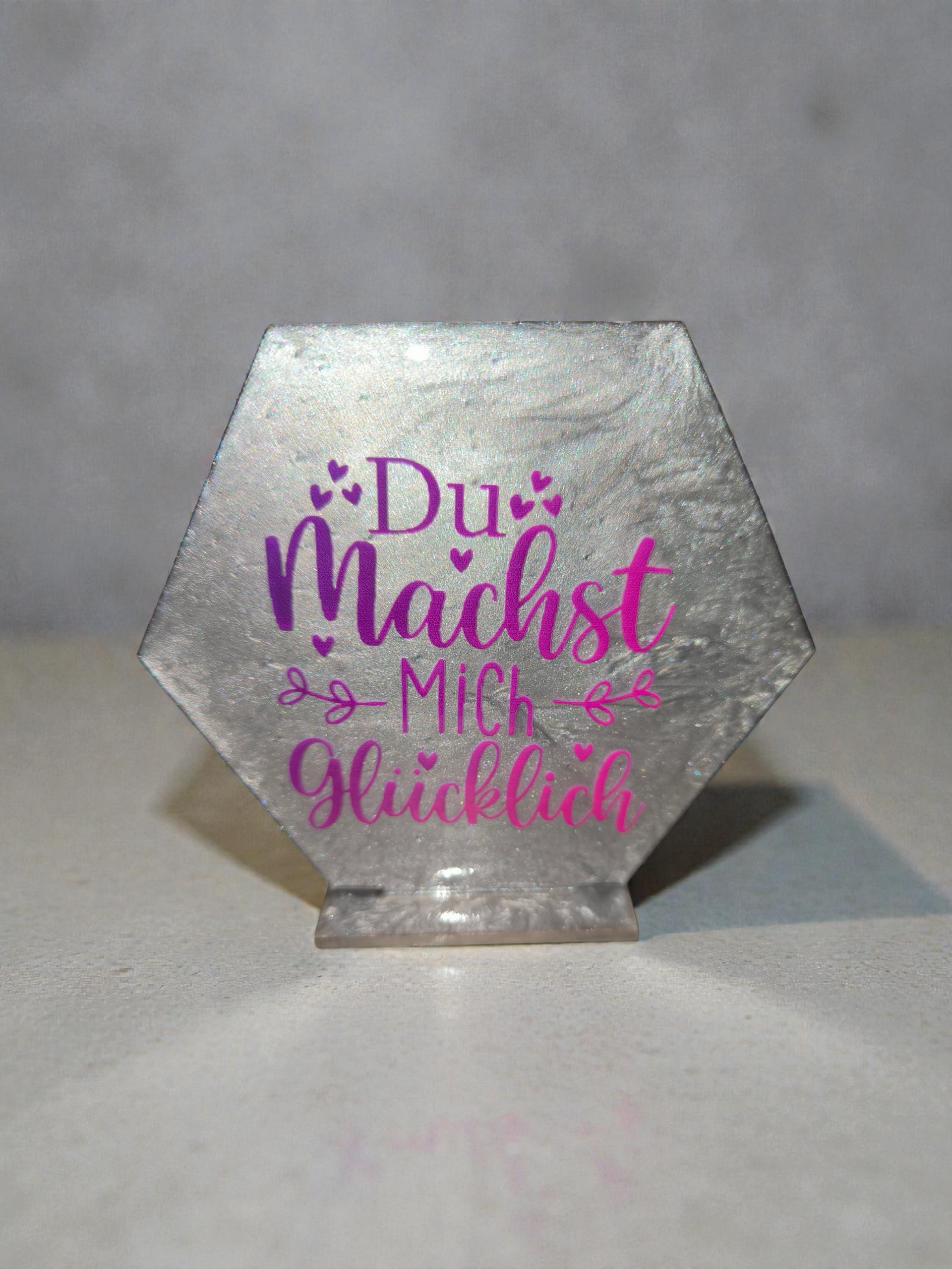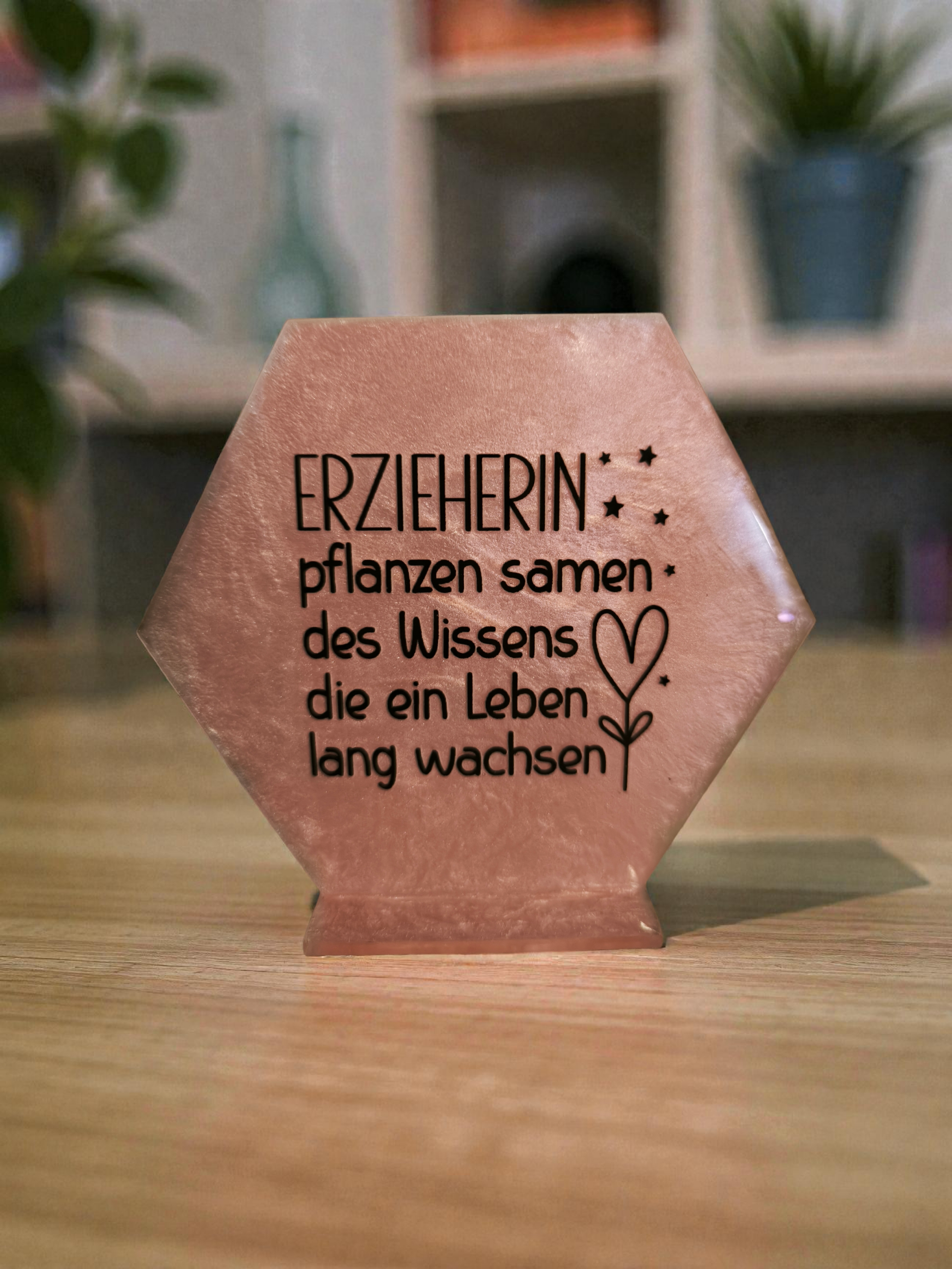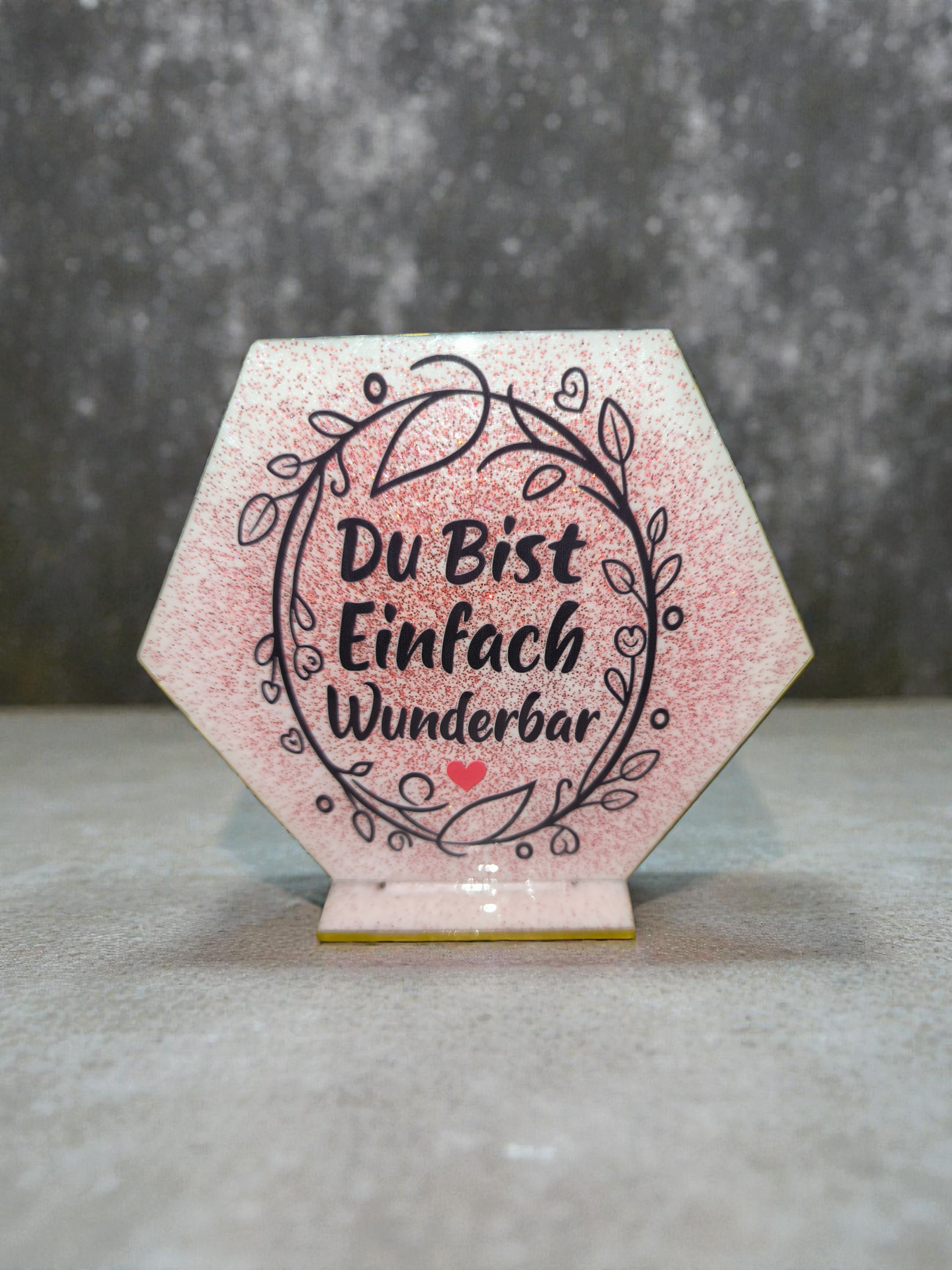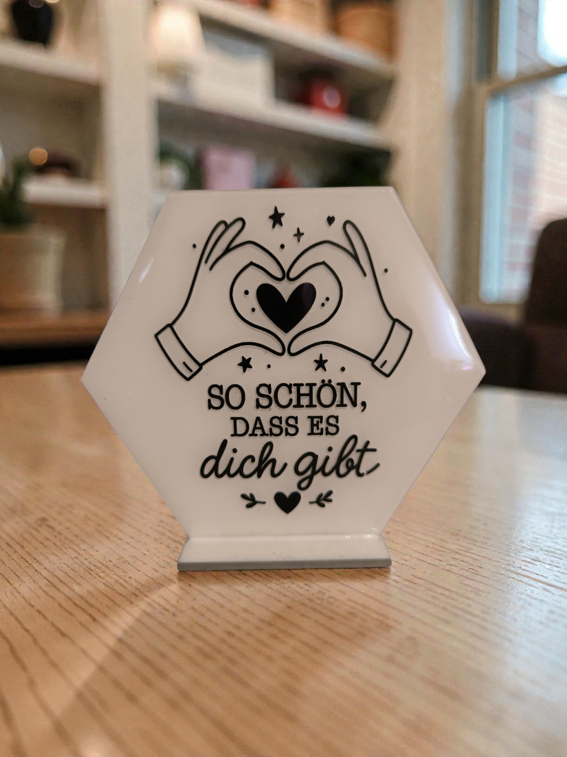 Diese liebevoll gestaltete Hexagon-Dekoration ist ein echter Blickfang. Mit zarten Motiven und inspirierenden Sprüchen bringt sie eine ruhige, positive Atmosphäre in jedes Zuhause. Perfekt als kleine Aufmerksamkeit oder Geschenkidee für besondere Menschen.
